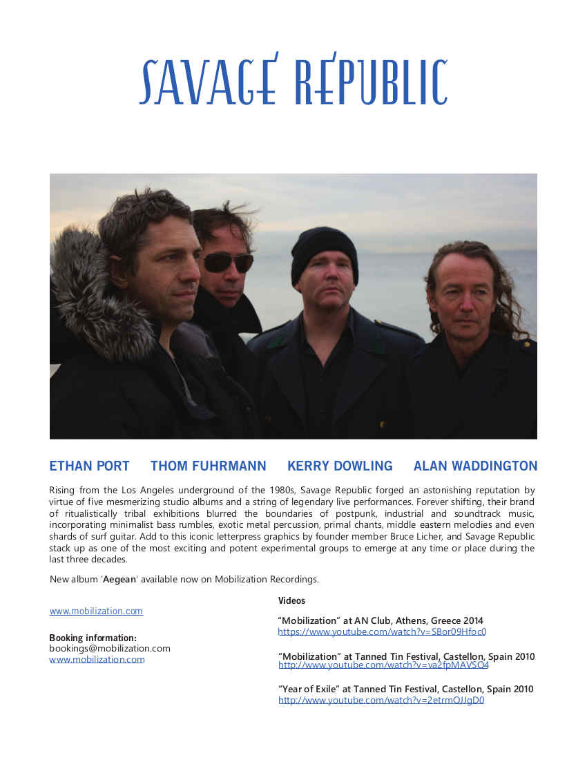 The limited edition 'Aegean 2xLP', 'God & Guns' 7", 'Varvakios' vinyl LP, and the Savage Republic back catalog are available from Mobilization.com